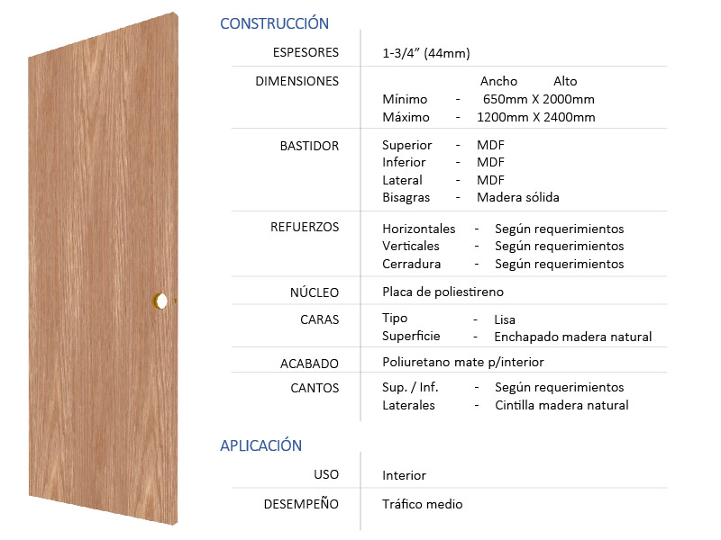 Puerta lisa por ambas caras, recomendada para interiores con tráfico moderado. Está compuesta de un bastidor interno de MDF y madera sólida, con un núcleo de poliestireno, dándole mayor rigidez; con enchapado de madera natural o entintada en ambas caras, con acabado de poliuretano mate.