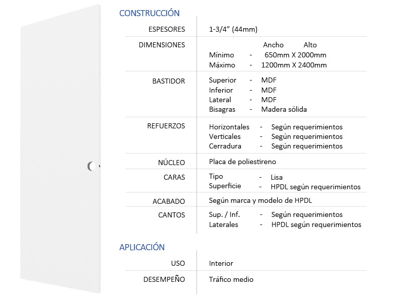 Puerta lisa por ambas caras, recomendada para interiores con tráfico moderado. Está compuesta de un bastidor interno de MDF y madera sólida, con un núcleo de poliestireno, dándole mayor rigidez; con acabado en Plástico laminado - HPDL (high pressure decorative laminate) según requerimientos en ambas caras.